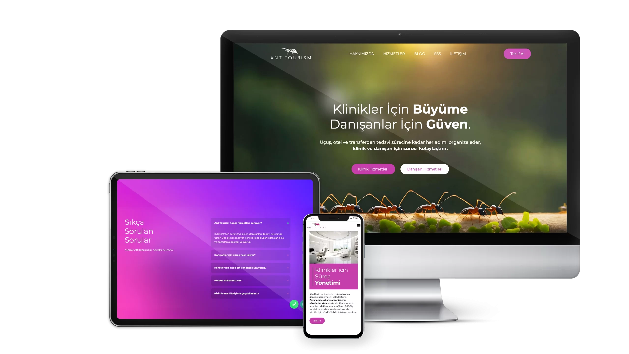 Ant Tourism için, markanın “İngiltere ve Türkiye arasında güvenli bir köprü” olma misyonunu yansıtan, modern ve kullanıcı dostu bir websitesi tasarladık. Hem kliniklerin hem de danışanların ihtiyaçlarına yönelik ayrıştırılmış bilgi mimarisiyle, karmaşık operasyonel süreçleri yalın ve anlaşılır bir kullanıcı deneyimine dönüştürdük.